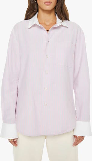Menswear-inspired shirting meets modern ease in this pinstriped button-up top cut in a relaxed silhouette with a contrast collar and elongated, flared cuffs.