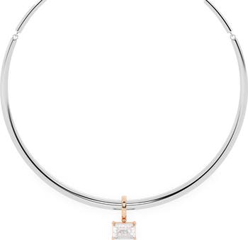 Round lab-grown diamonds cluster into the baguette-shaped pendant that dangles from this collar necklace done in liquescent 18-karat gold.