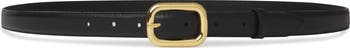 Rounded edges underscore the modern aesthetic of a glinting buckle on a slim leather belt featuring an embossed finish.