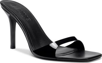 A slender strap and angular square toe bring crisp angles to a minimalist slide sandal made from faux leather and lifted by a soaring stiletto heel.