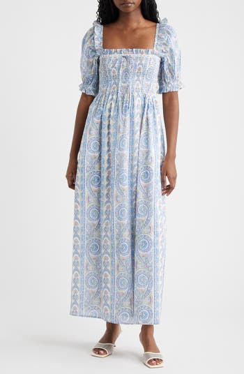 Subtle lace and ruffle trim frame the square neckline and puff-sleeve cuffs of this paisley midi dress designed with a smocked bodice that defines the silhouette.