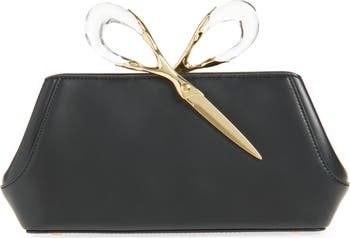 Hand-sculpted Lucite® and molten 14-karat gold-plated handles symbolize an oversized pair of scissors atop a sculptural leather clutch suspended from an optional chain strap for easy carry.