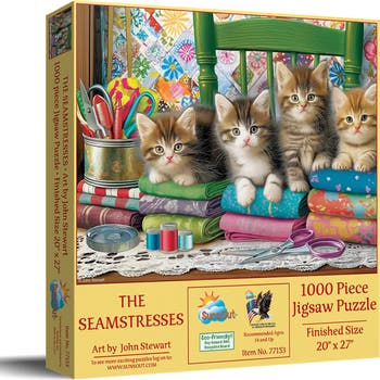 The Seamstresses 1000 Piece Jigsaw Puzzle - 1000 pc Jigsaw Puzzle - Completed Size: 20" x 27" - Puzzle Artist: John Stewart - Interlocking Pieces and Durable Construction: SunsOut jigsaw puzzles feature interlocking pieces that fit securely, making assembly easier and reducing frustration. Made with high-quality recycled cardboard, they are durable and to easy to work with - Warranty: SunsOut puzzles being made in the USA ensures high manufacturing standards include a worry-free guarantee ensuring any issues with missing or damaged pieces are resolved, reflecting SunsOut's commitment to quality and customer service. - Eco-Friendly Materials: SunsOut puzzles are crafted with eco-friendly materials