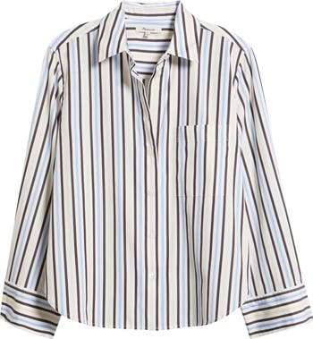 An easy take on the classic button-up, this striped shirt features a point collar with a few buttons on the placket for an intentionally open look. Crafted from a crisp, midweight cotton poplin, it's slightly structured and very versatile.