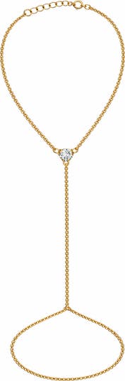 A single cubic zirconia stone adds highlight to this delicate hand chain plated in gleaming 18-karat gold.