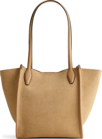 Coming in suede, this softly structured tote has collapsible sides that close with a dog clip that doubles as a key fob and a magnetic snap closure. It can hold a sunglasses case, phone, wallet and other essentials—plus, it has comfortable leather shoulder straps.