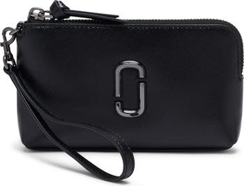 This compact leather clutch packs a major style punch with gleaming logo hardware and a dainty wrist strap.