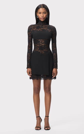 A new long-sleeve silhouette from Look 13 of the Resort '26 Lookbook. The Solene Dress is cut from stretch crepe featuring sheer stretch lace that creates a strapless illusion beneath a high neckline. The mini-length dress is finished with scalloped trim detail along the hem, cuffs and neckline and an invisible center-back zip.