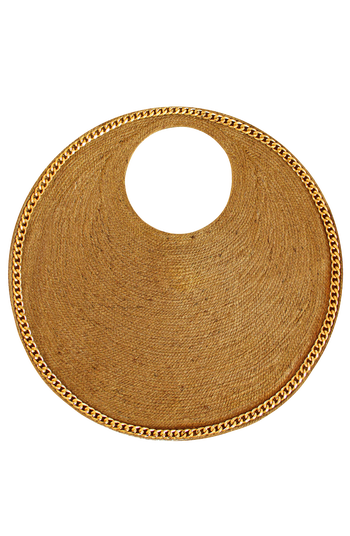 Introducing the iconic SOLO Bag—a celebrated design honored with the prestigious Design Excellence Award from the Fashion Council. Named after the simple pleasures of farmer’s market find, the SOLO series embodies the vibrant spirit and effortless charm of the spring and summer seasons. Generously sized to accommodate your daily essentials and more, the SOLO Bag is the perfect companion for weekend markets, beach days, or spontaneous adventures. Meticulously handcrafted from durable natural jute straw, this statement piece combines functionality with refined sophistication. Whether slung over your shoulder or carried effortlessly on your arm, the SOLO Bag exudes effortless grace, embodying the joy and beauty of sunlit days and seasonal simplicity. Composition: 100% Jute fiber Diameter: 20 inches Depth: 1 inches Color: Golden brown Featuring a gold metal chain trim