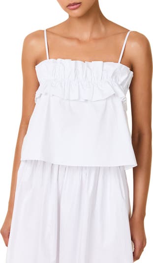 The subtle sheen of cotton sateen refines a charming babydoll cami boasting a frill-encircled bodice.