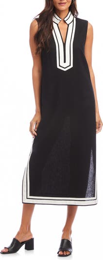 Framing contrast trim adds easy elegance to this lightweight linen-blend midi detailed with airy side slits and a split collar.