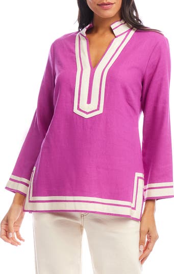 Framing contrast trim adds easy elegance to this lightweight linen-blend tunic detailed with airy side slits and a chic split collar.