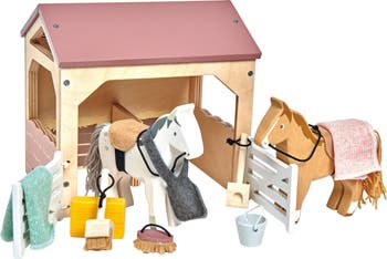 Kids can fulfill their equestrian dreams with this adorable wooden playset featuring a pair of ponies and all the necessities for feeding and grooming.