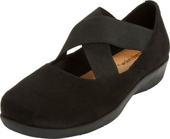 A supple suede-like upper with crisscross elastic straps refine an essential Mary Jane flat grounded by a lightweight bottom with cupped insole to stabilize heel.