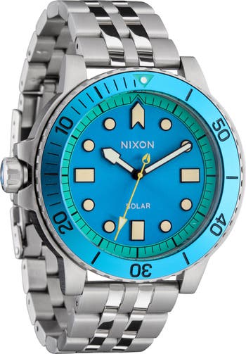 Inspired by dive watches from the '60s, this solar-powered watch features a destro crown for left-handed wearers or more comfortable wear for right-handers. The everyday style features a comfortable five-link bracelet and a substantial stainless steel case with an aquatic-hued dial and bezel,