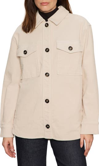 Keep it cozy for the between season in a boldly buttoned shacket cut from creamy corduroy.