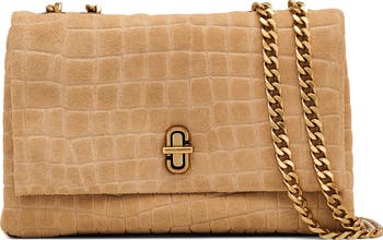 Aged-finish hardware and croc-embossed suede highlight the structured profile of a versatile bag featuring a pull-through chain strap that converts for shoulder or crossbody wear.