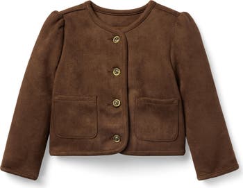 A jacket that will always be in fashion’s favor. Designed in soft sueded fabric with puff sleeves and enamel buttons, plus pockets, of course.
