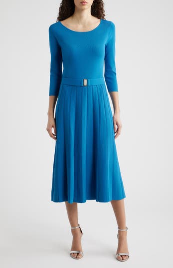 Knit in a shape-retaining Milano stitch with vertical ribbing at the skirt, this graceful ballet-neck sweater-dress is framed with three-quarter sleeves and cinched with a removable belt.