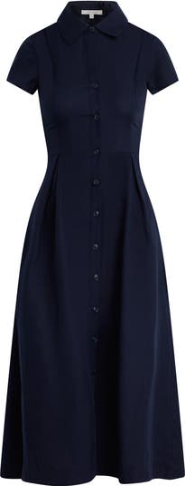 Slight sleeves frame this sophisticated shirtdress cut from crisp a linen-kissed blend and accented with inverted pleats to enhance its flared silhouette.