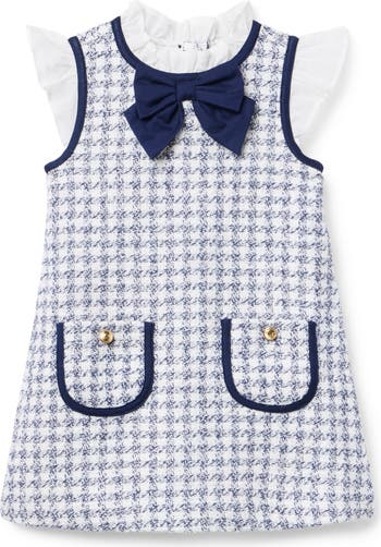 Follow the thread to a fashionable season. Our houndstooth tweed dress is tailored and timeless, designed with ruffle details, a contrast bow and patch pockets too.