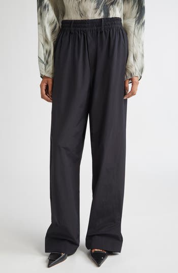 An elasticized waistband underscores the easygoing appeal of cotton-blend wide-leg pants featuring snaps at the lower outseams to create a cinched look.