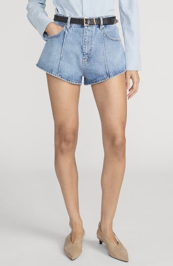 Front pleats bring clean structure to these high-rise denim mini shorts finished in a faded wash with a subtly flared leg and classic five-pocket styling.