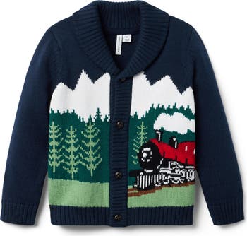 All aboard for festive style in our cozy cardigan. Made in pure cotton with an intarsia-knit train design and classic shawl collar, it's just right for any occasion.