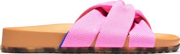 Cross-twist straps lend sculptural softness to a slide sandal made with an easy warm-weather attitude. The hemp-blend upper and grippy sole are balanced by a plush removable footbed for all-day comfort.