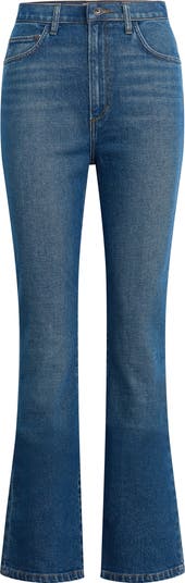 Casual-chic for day or night, these low-stretch jeans in a classic blue wash feature a superhigh waist and extralong, slim legs that gently flare to bootcut hems.