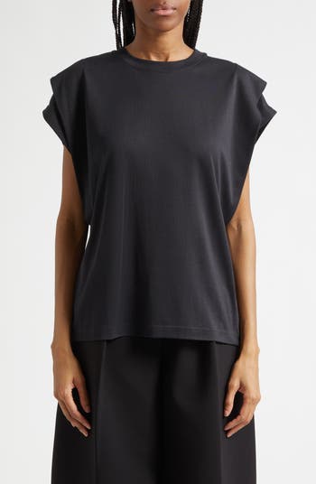 This roomy crewneck T-shirt made from paper jersey is engineered with layered cap sleeves for extra volume at the shoulders, which tapers in slightly at the hips.