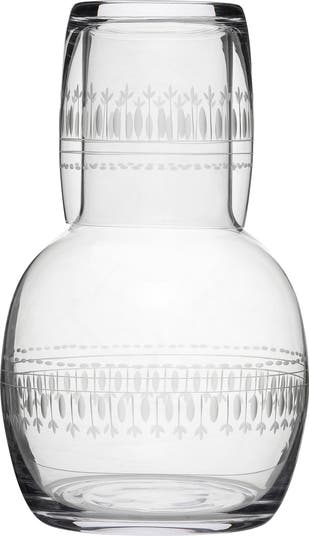 A delicate oval motif graces an elegant carafe done in handblown, hand-engraved crystal and paired with a matching glass.