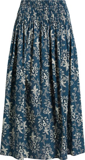 A foundational piece for any wardrobe, this breezy skirt is cut from airy, textured cotton printed in a swirling bandana print and shaped at the hips with rows of elasticized shirring for an easy fit.