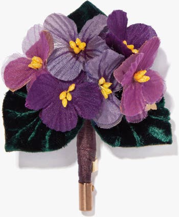 William Shakespeare's favorite flower, violets are often associated with modesty and loyalty stemming from their subtle beauty and tendency to thrive in quiet, shaded spots. A combination of delicately hand-painted violet and lavender silk habotai and silk chiffon petals are paired with hand-dyed yellow sparkle stamens and three emerald green silk velvet leaves. The violet is the birth flower for the month of February and is the state flower of Illinois.
