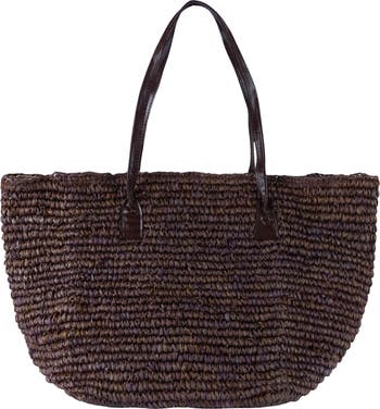 Smooth leather trim highlights the woven raffia exterior of a resort-worthy tote featuring a spacious interior and slim pair of shoulder straps for on-the-go convenience.