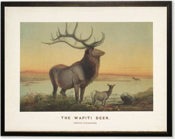 This painting-reproduction print, displayed in a copper and black frame, features two Wapiti Deer. Sized at 24 inches by 18 inches, this made in the USA frame makes for a beautiful addition to any wall.