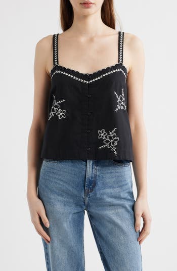 Delicate floral embroidery and a softly curved sweetheart neckline give this button-up top an easy, romantic feel suited for casual date-night plans.
