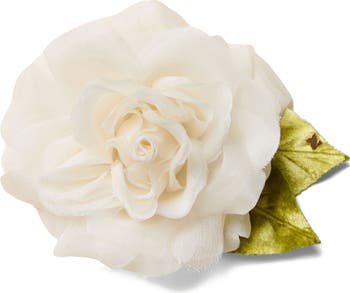 Purity, innocence, loyalty and new beginnings are all associated with the white rose. This exquisite bloom is lovingly handmade with white silk habotai, silk organza and silk crinkle chiffon, and features chartreuse green silk velvet leaves. The rose is the birth flower of the month of June and is the state flower of Washington D.C, New York, Iowa, Georgia, North Dakota and Oklahoma.