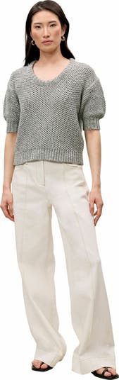 This sweater exudes refined elegance in ivory and light blue tones, featuring an artfully twisted neckline detail that adds architectural interest. Crafted from premium Pima cotton, the short-sleeve design combines luxurious comfort with sophisticated style, creating a piece that's both graceful and effortlessly wearable.