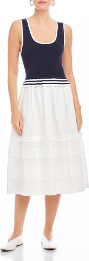 A knit bodice and poplin skirt combine to bring a mixed-media effect to a midi dress that delivers the layered look with one-and-done ease.