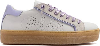 The Thea Lilac Gum is wrapped in white leather and suede complemented by lilac leather accents and matching lilac shimmer laces. Our signature P448 platform gum soles finish off the look. Swap in the extra pair of silver laces for a shiny statement. This playful platform runs small, so be sure to size up if you’re in between.