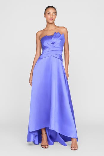 Strapless mikado gown in a luminous periwinkle hue, with an asymmetrical fan-draped bodice and wrapped waist for crisp definition. Finished with a high-low skirt that moves with airy drama. A refined choice for formal celebrations.