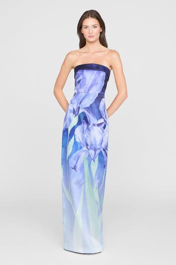 Mikado strapless column gown with a sleek neckline band and painterly florals inspired by Art Nouveau glasswork. Layered color and repeated angles add depth and a subtle glass-like effect. A signature THEIA silhouette for evening celebrations.