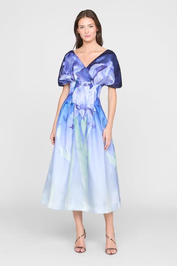 Painterly floral mikado dress in a soft blue gradient, bringing a fresh sense of movement to a signature THEIA silhouette. Shaped with subtle waist darting and gentle volume through the sleeves and skirt. A refined choice for garden parties and daytime celebrations.