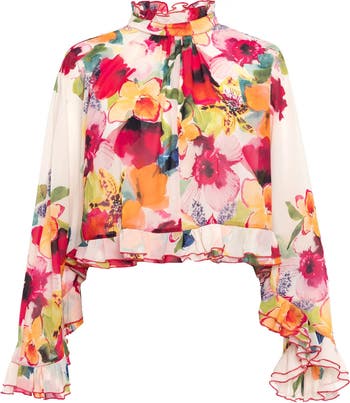 Delicate and feminine, the Theia Orchid Print Ruffle Blouse is designed with tiered ruffles and a ruffled slit neckline. Crafted from recycled matte chiffon, this sustainable piece showcases an exclusive orchid print, adding sophistication to any outfit.