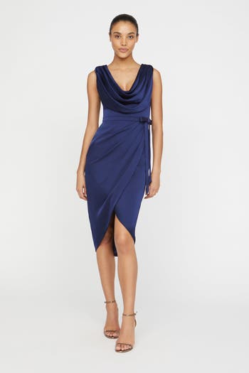 The Stephanie Wrap Dress is a vibrant cocktail look with a soft cowl neckline, flattering wrap skirt, and delicate bow-tied waist. Crafted in glossy double-faced satin with trim detailing, it’s a standout choice for youthful celebrations and chic evening events.