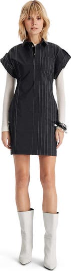 This striped taffeta mini dress features a structured shirt silhouette with sculpted cap sleeves, stitched jacquard texture, and subtle waist shaping. Designed for versatility, it shifts effortlessly from day to night with a change of accessories.