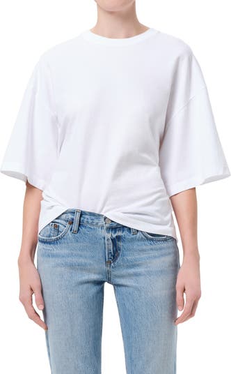 A drapey belted back updates this boxy cotton top framed by elbow-length sleeves.