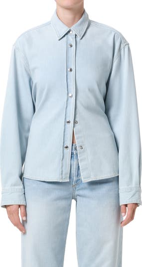 A snap-front denim shirt pairs classic appeal in the front with a modern surprise in the back, where a cropped, flutter design is held together with an adjustable strap. Rugged yet playful, it's a fresh twist on a timeless staple.