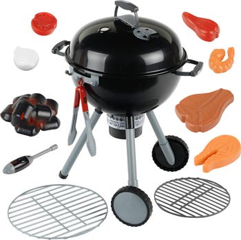 - The toy kettle barbecue comes with a charcoal grate and barbecue tongs, as well as barbecue food such as salmon, T-bone steak and vegetables.